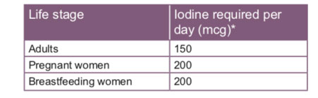 The World Health Organisation recommends the guideline for adults is 150 micrograms (µg) a day, and 250µg/d for pregnant women and breastfeeding women. Children age 0-5 should have 90µg/d and children 6-12 years should have 120µg/d.