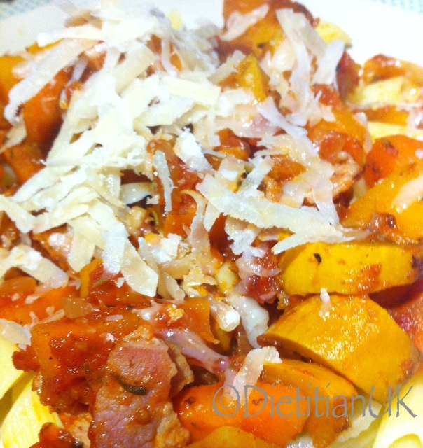 So this week I’ve had fun rediscovering butternut squash. This pasta dish was inspired by a meal a friend used to make using gammon and cream. Cooking with cream really isn’t my thing, so I’ve altered it to a tomato based dish. The rest of the squash went into a truly scrummy butternut and lentil curry.