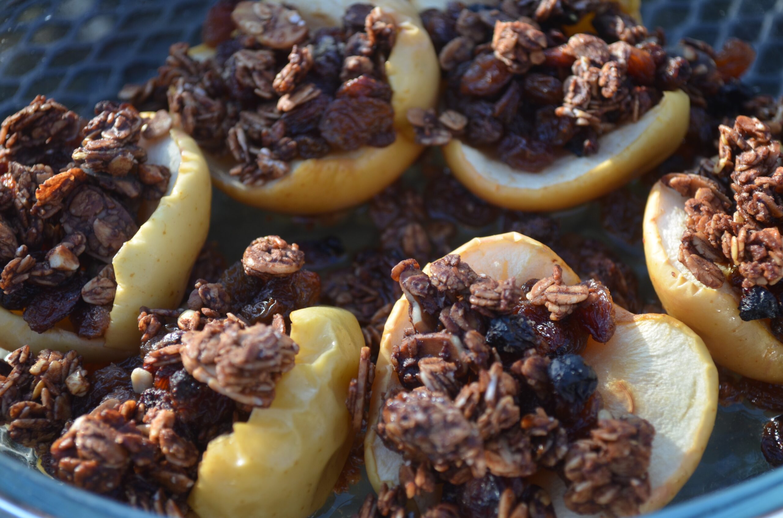 - Fill the apples with the raisins, dot with a little butter and press the granola over the top.
