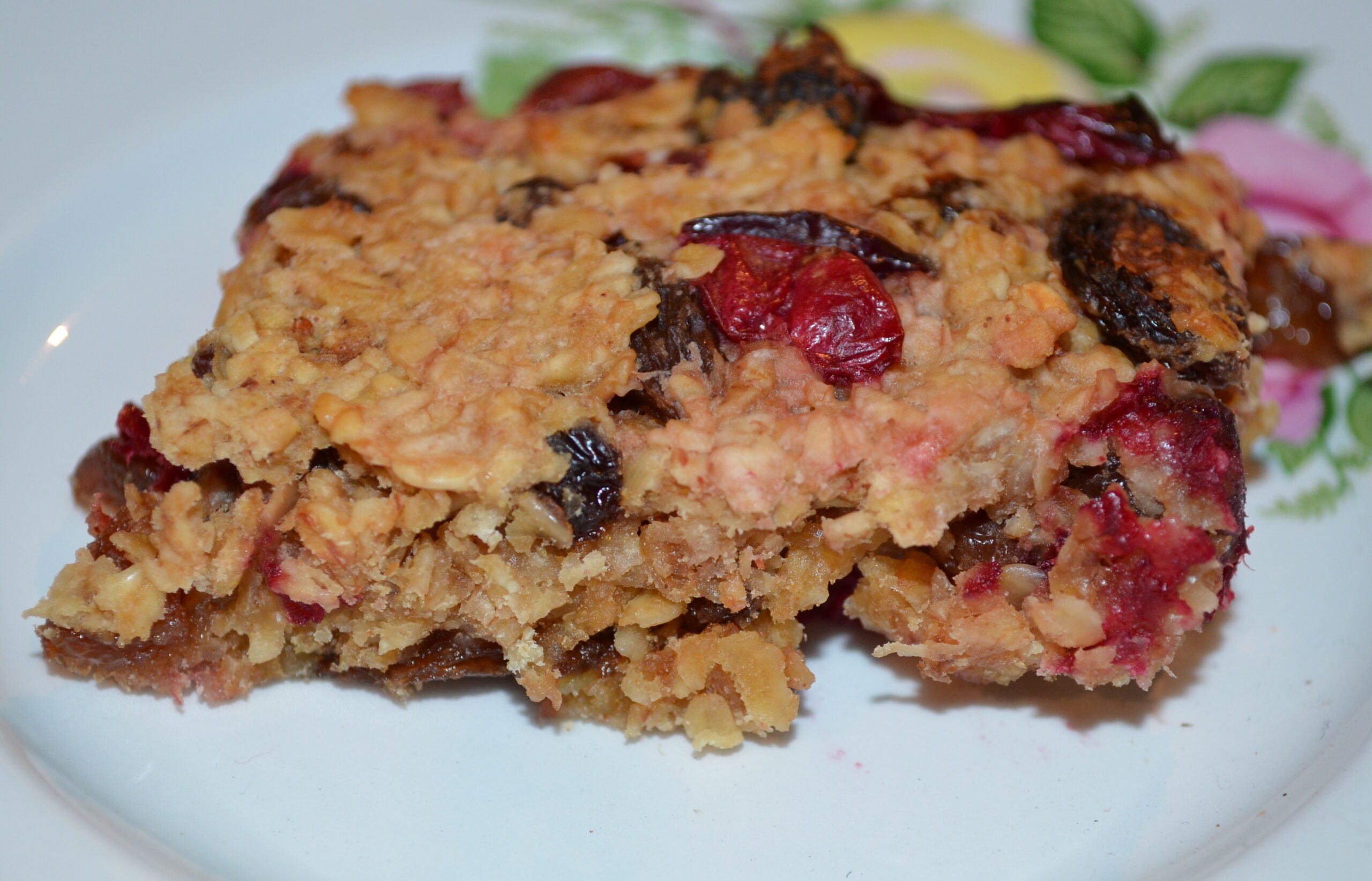 Christmas has come and gone but I’ve still got cranberries to use up. I’ll be honest, I’m a flapjack-a-holic, so even after making the cranberry muffins I had to play around and make up some flapjacks too. Life with out flapjack is not worth thinking about. However my flapjack has to be a healthier version, gone is the treacle, syrup and lashings of butter…. instead I’ve increased the fruit, got rid of the sugar and used honey and reduced the butter. The result is a tangy, moreish morsel that goes perfectly with a decent cuppa.