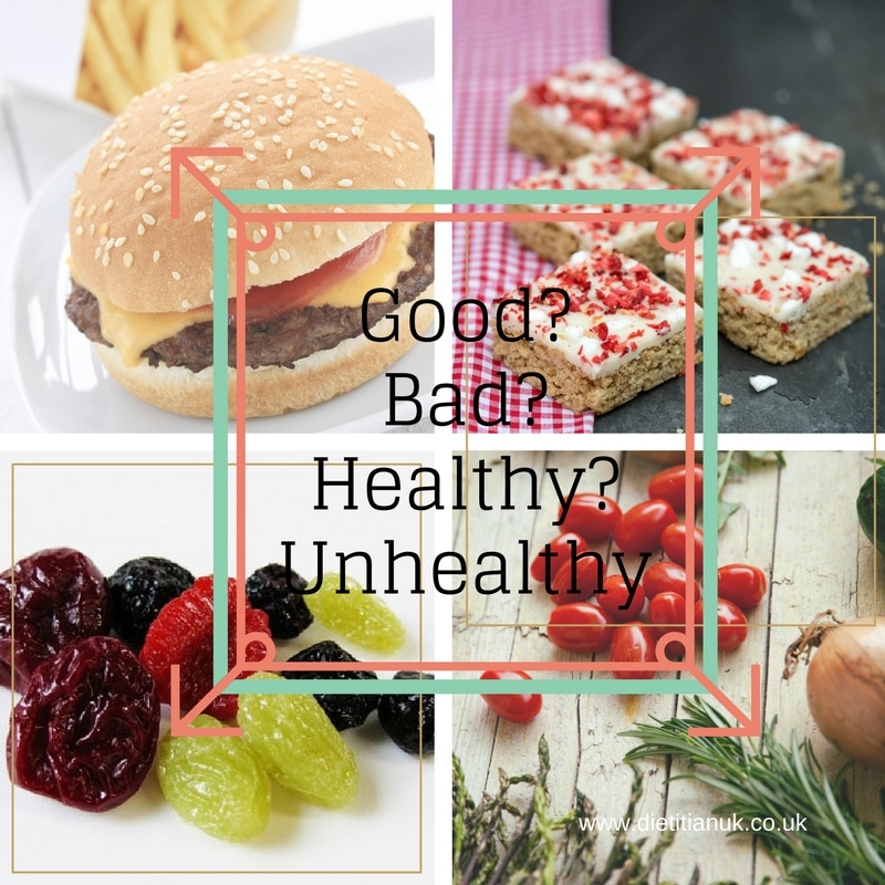 Bad foods seem to be ones that are high in sugar, fats and calories. Foods that are “not healthy” and that exert a “bad” affect on the body. They can range from fast food, processed food and high fat/high calorie snack items to carbohydrates and dried fruit.
